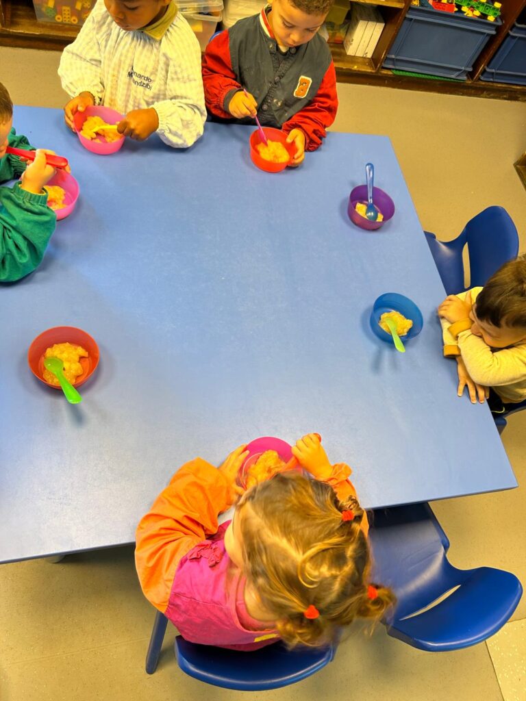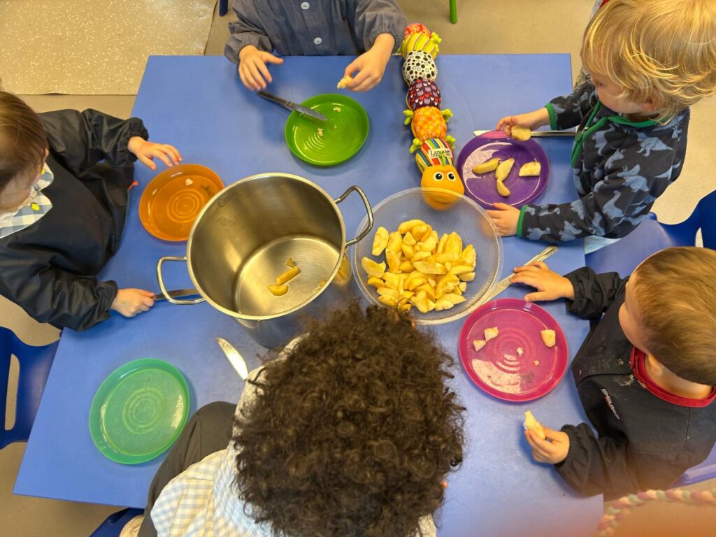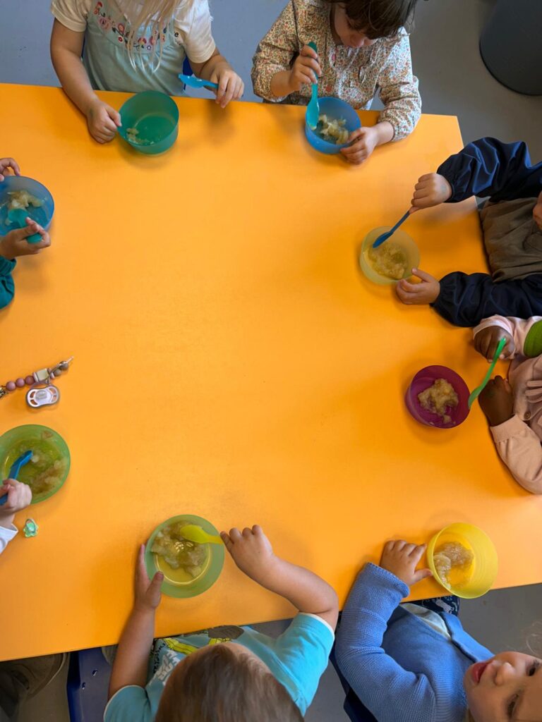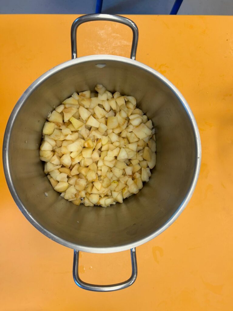 Nous avons trouvé une grande quantité de pommes dans le jardin de l’école. Après en avoir goûté quelques-unes, il en restait encore beaucoup… Nous avons donc décidé de préparer de la compote. Un vrai régal pour tous !