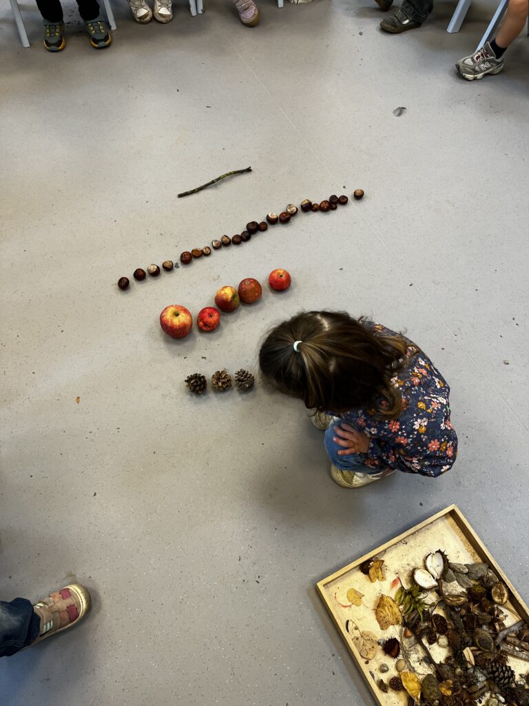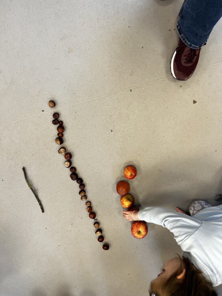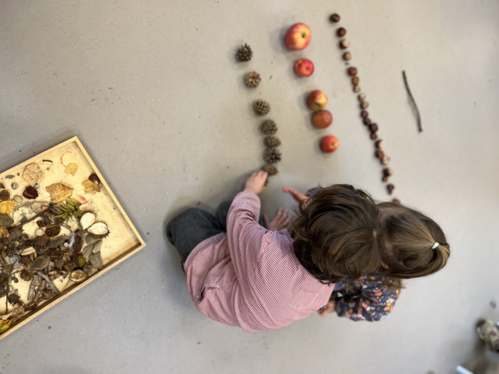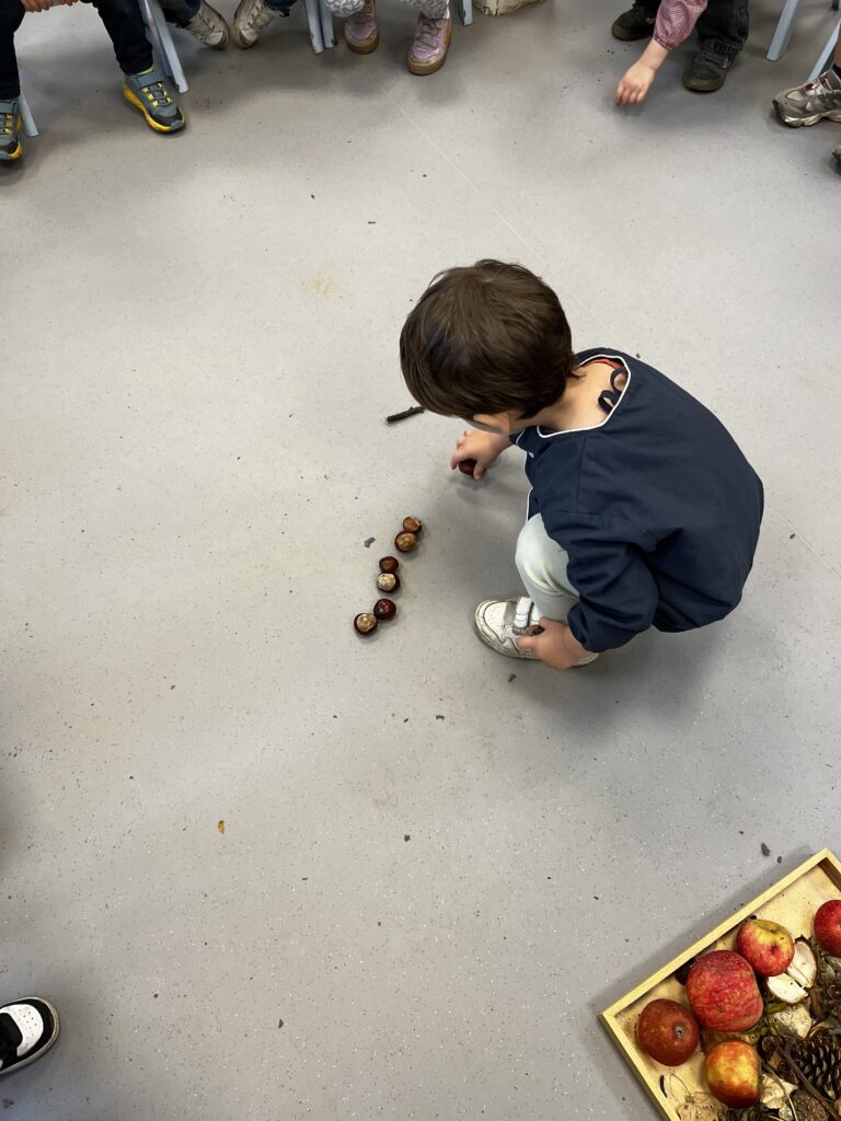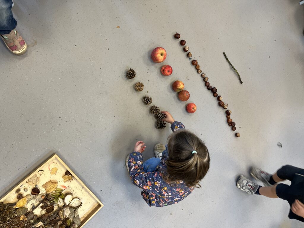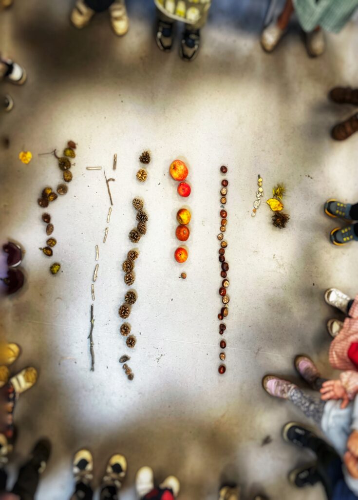 Avec les petits de la classe de Cristèle, nous sommes partis explorer le jardin. Nous y avons trouvé de nombreux trésors : certains piquent, d’autres roulent… Les enfants ont eu l’idée de les rassembler pour former de longues files.