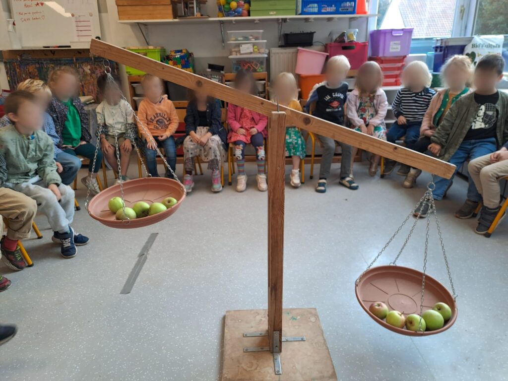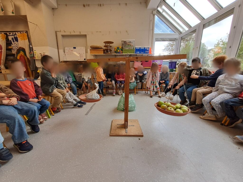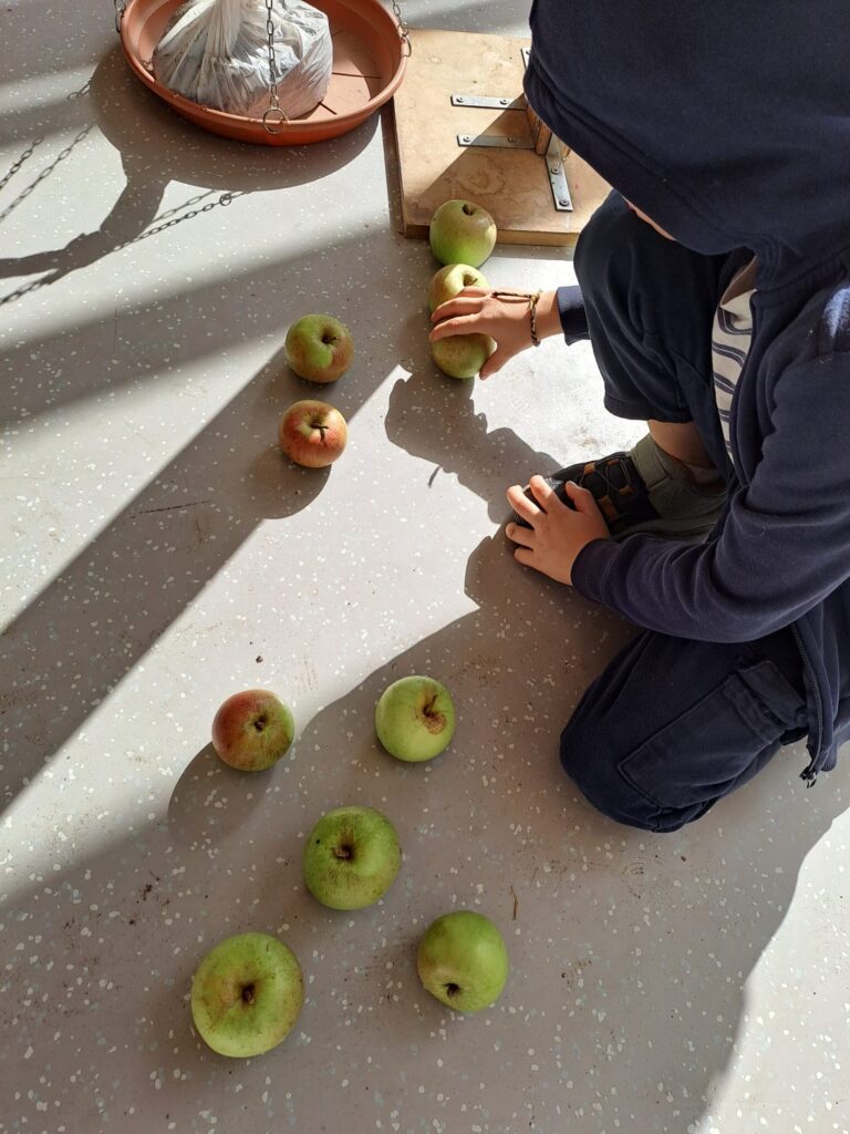 Nous avons eu la chance de recevoir un gros sac de pommes, offert par un élève de la classe. Cette belle surprise a donné lieu à de nombreuses activités : la cueillette de pommes dans notre propre jardin, la comparaison de masses sur la balance (cinq pommes d’un côté, cinq de l’autre, mais pas toujours le même poids !), l’équilibrage de la balance avec un sachet de terre et des pommes, la représentation et le dénombrement de la quantité « cinq », la préparation d’une compote, ou encore la réalisation de pommes en terre glaise. D’autres activités artistiques viendront bientôt enrichir le projet.