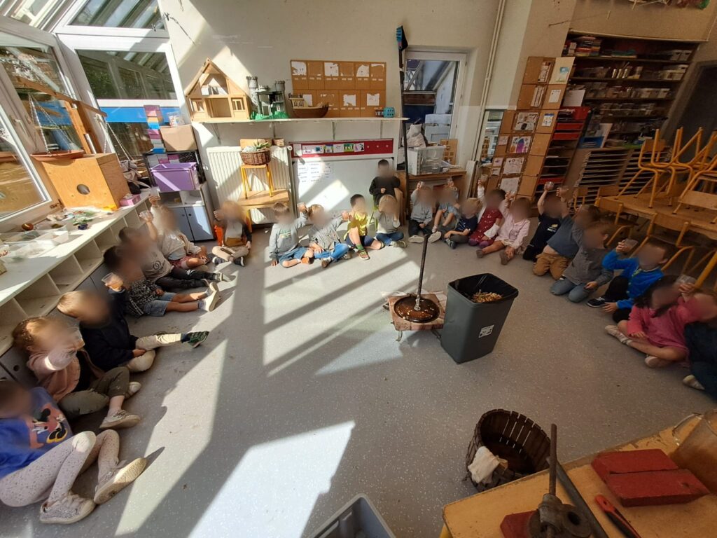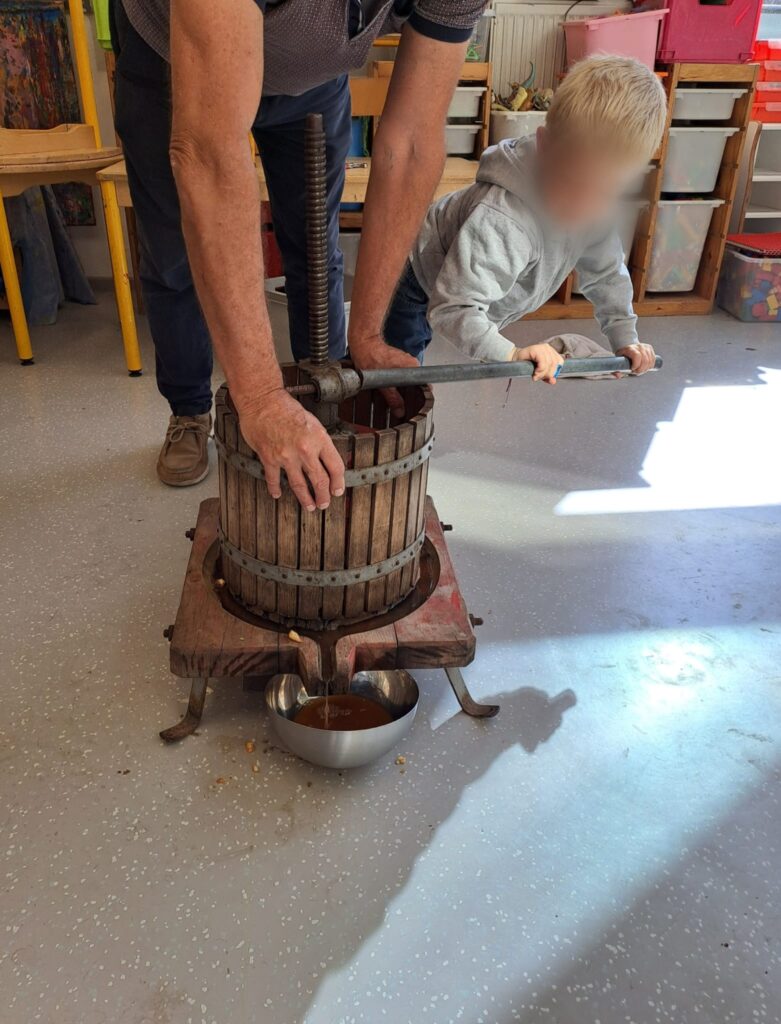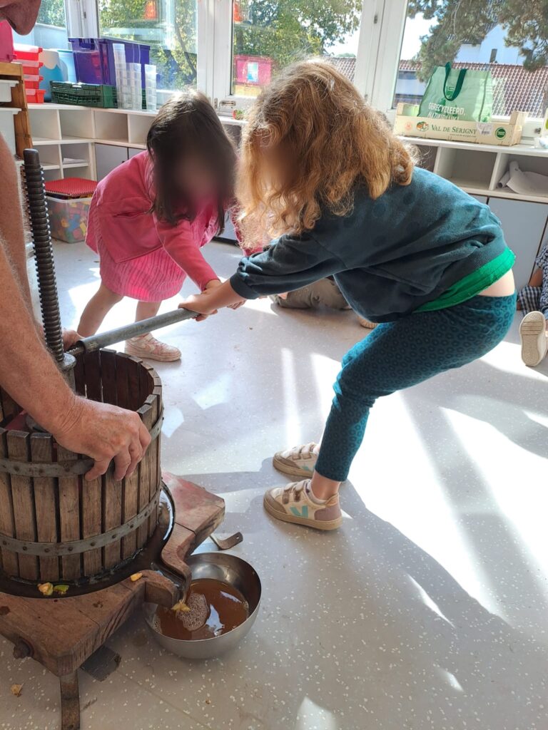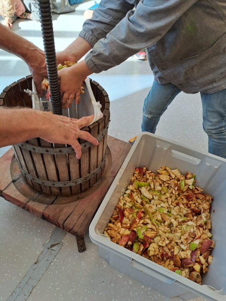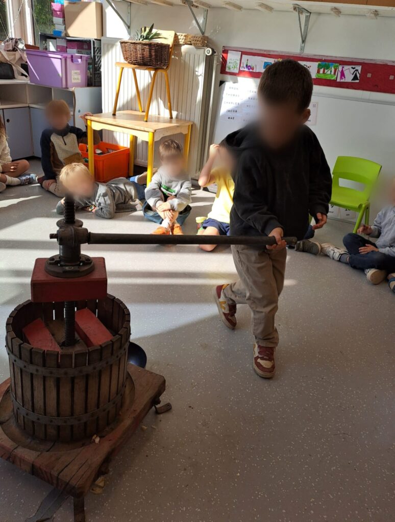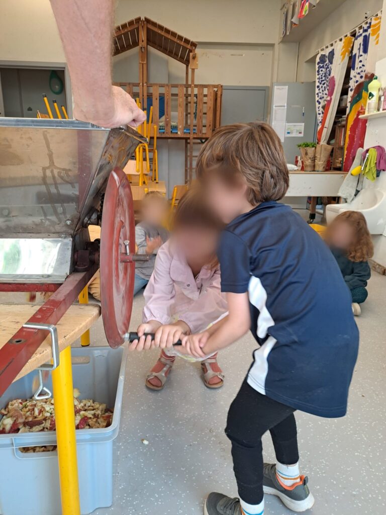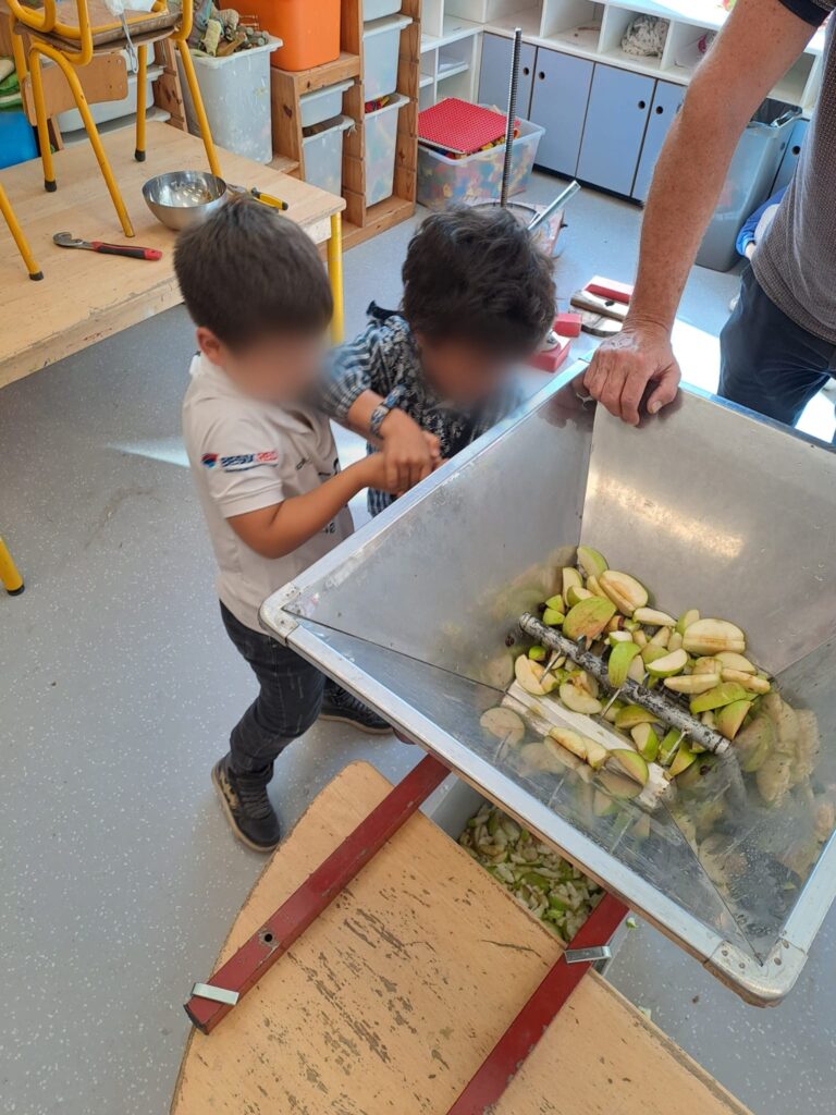 L’activité du jour a particulièrement enthousiasmé les enfants : la fabrication de jus de pommes grâce à une machine étonnante. Chacun a pu participer, observer, sentir, s’entraider et enfin… déguster ce délicieux jus. Une belle expérience de partage et de découverte !